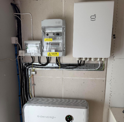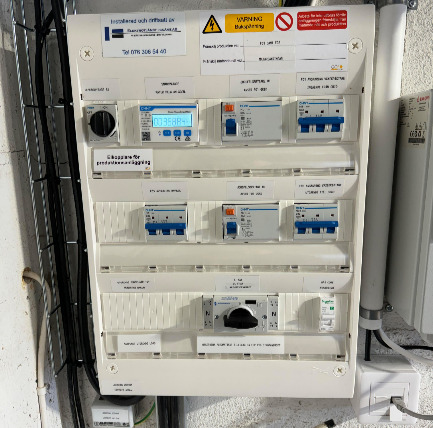 Exempel på en anläggning vi gjort med SigenStor batteri och växelriktare i en stapel med Sigenergys egen ö-driftslåda samt en färdigbyggt ö-driftcentral med ett begränsat antal grupper på ö-drift. Dvs inte hela huset.
